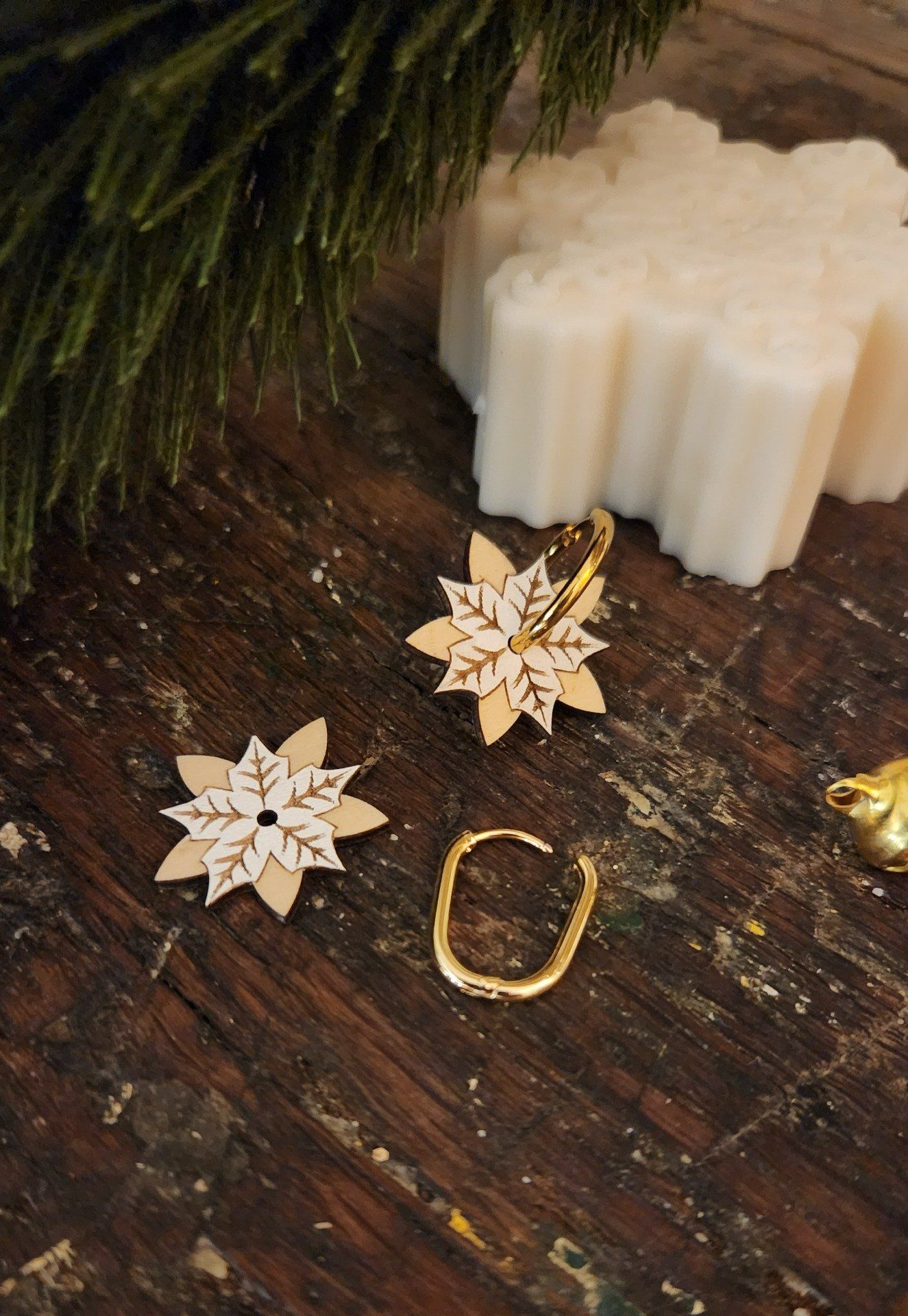 Boucles d’oreilles artisanales avec créoles en acier inoxydable doré et module de poinsettia en bois découpé et peint à la main. Créoles ovales de 2,3 cm de long et motif fleur de Noël de 2,5cm de diamètre, fabriqués en Haute-Savoie.
