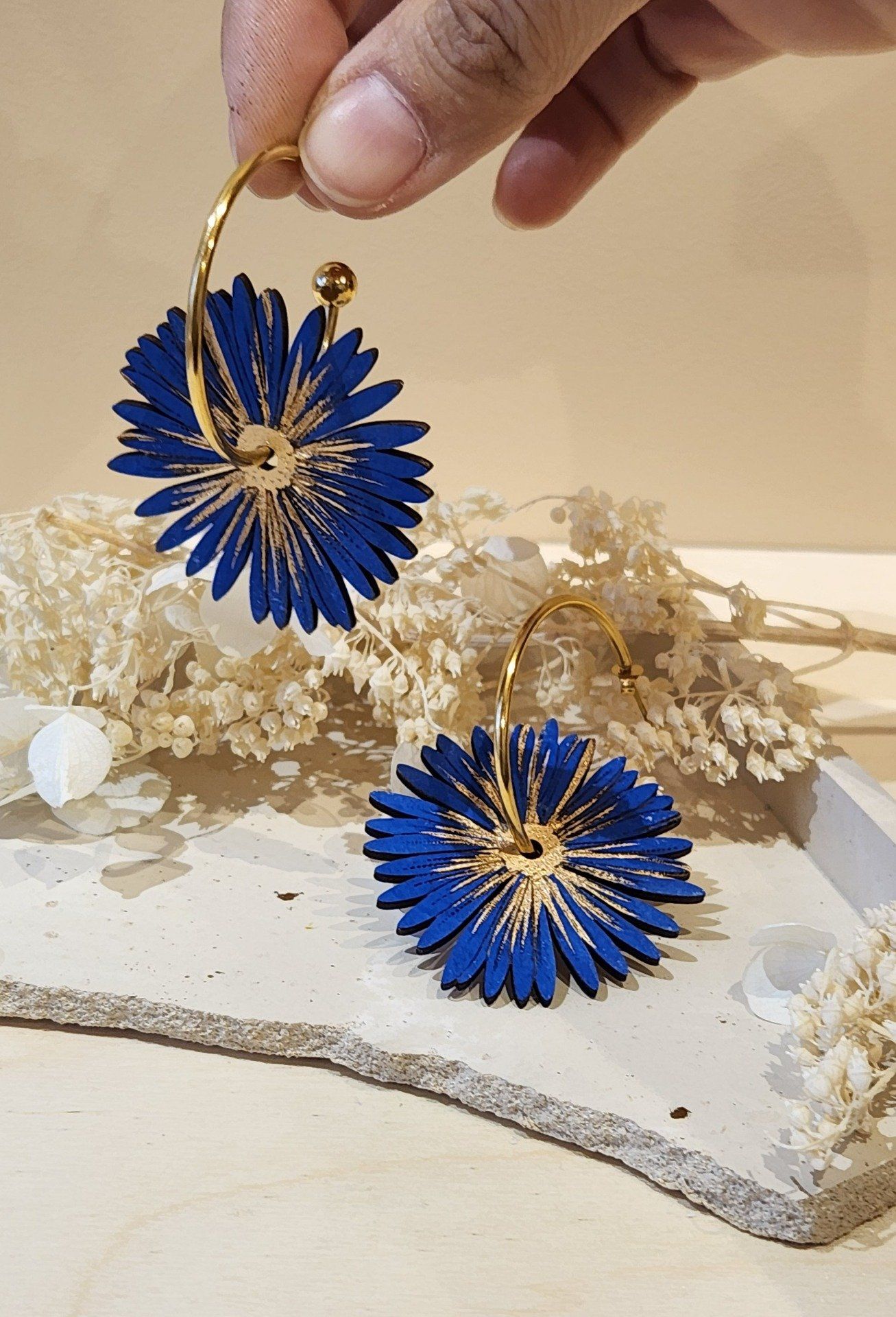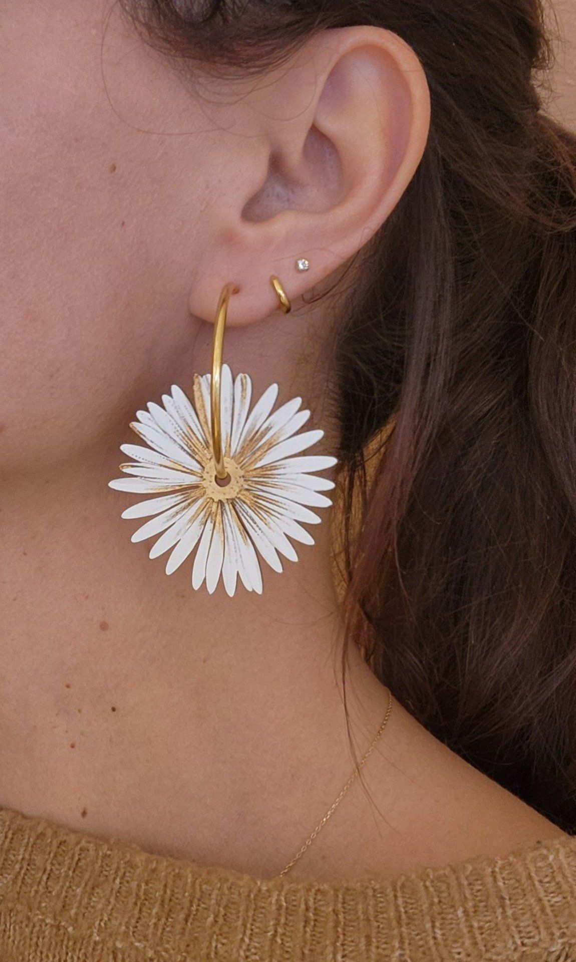Idéales pour un look bohème, artistique ou contemporain, ces boucles d’oreilles créoles avec fleur peinte à la main sont une création artisanale pensée pour sublimer votre quotidien.